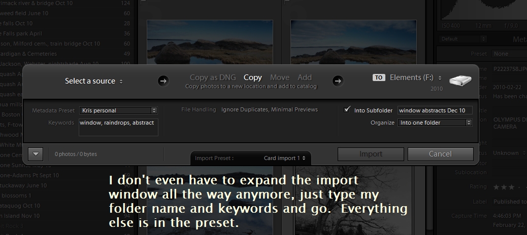 The next thing I’ve done is set up an import preset.  I learned about this at the Adobe channel on youtube and I’m so glad I found it.  It will automate a lot of the things I do including modify metadata.