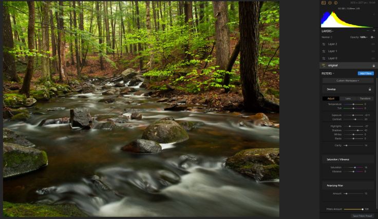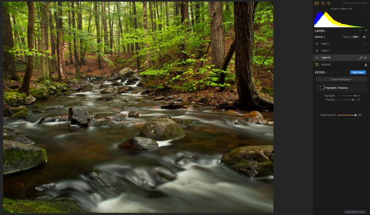 Layer 0 got a little brush of the highlights and shadows tool. I kind of wish it used exposure like Lightroom does, but I’m still finding my way. I lightened the tree trunk a bit by bringing up shadows and also lightened the highlights in the water in the nearest part of the photo. I think it adds balance to the overall scene.