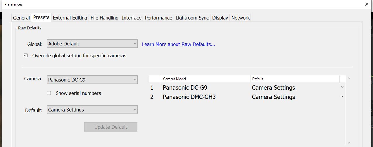 Clicking the box Override global settings for specific cameras will bring up a list of the cameras it has detected in your Catalog. Find the one you want and then choose Camera Settings and create the default. Now that will be the Profile used on all your photos from that camera. You need to do this for each one individually. This is most beneficial if you really like a particular style of image your camera produces and you don’t want to change that baseline. Be careful not to change the Global Settings – if you do the Adobe RAW Profiles will disappear and you’ll be left with basically Color or Monochrome. If you accidentally delete your Camera Matching Profiles, go back and make sure the default for your camera is set to Camera Settings and not Adobe. For a detailed set of instructions visit Adobe’s website.
