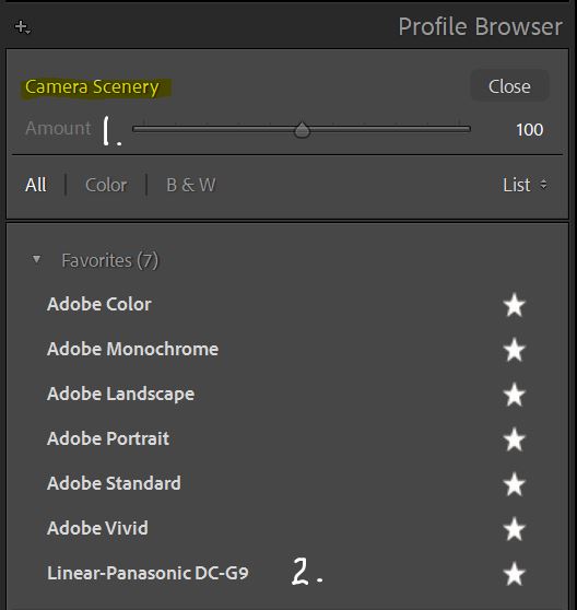 - Adobe makes its standard Profiles favorites, but you can change this anytime or add your own as I have with a Linear Profile.