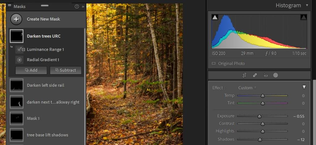In the first one you can see I’ve applied a Radial Gradient to lower exposure to that section of trees, but it’s affecting all of the space inside the Gradient selection (the pin is the center of it). I don’t want that, I only want to pull the darker areas down, leaving the lighter parts to show the sun shining through the branches. The easiest way to isolate a specific tonal value or range of values is to click the Subtract button below the Mask and choose Luminance Range.