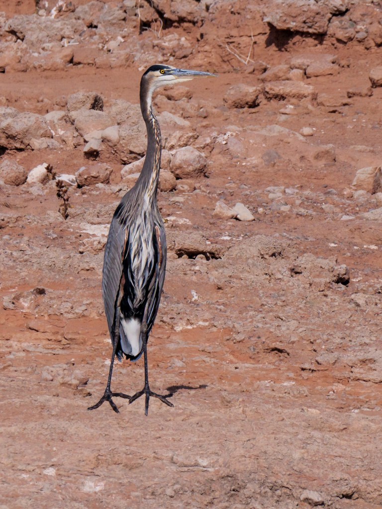 Ted continued to show us the lake and hopefully find more birds. Soon I spied a gorgeous (and quite dark) GBH, first up on a cliff and then down on the shore where it landed, unfortunately only to be chased off again. But its aggravation was my reward, check it out –