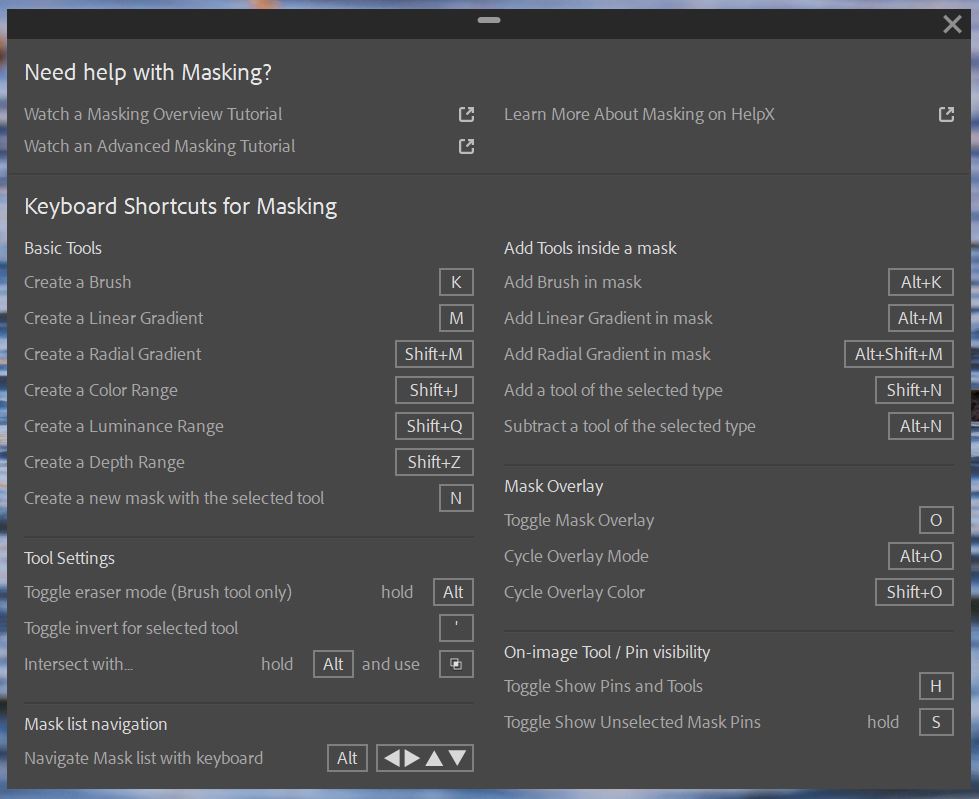 Isn’t that great? Open it by clicking on the ? button at the top of the Mask Panel. If you scroll up and look at the Color Range refine slider image you’ll see it has a Learn More link that goes to Adobe’s main page about the new Masking tools >> https://helpx.adobe.com/lightroom-classic/help/masking.html