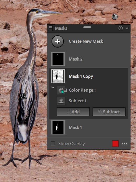 For this image I started with Select Subject and it did a great job picking out the heron – feet and all so I didn’t have to modify the Mask. After making that adjustment I copied the mask and inverted it to select the background. I wanted to bring up the orange color in the rocks so I chose Intersect With Color Range and used the eye dropper tool to select a section by dragging to create a square.