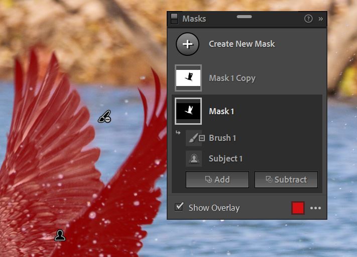 As I did with the grebe photos, you’ll often want to work the subject and the background separately. The fastest way to do this is to copy the SS Mask to a new one and then Invert it. It works, but if you’ve made Add or Subtract alterations, those can get wonky with the Inversion. Start by right clicking on the Mask Group and choose Duplicate – the Mask and all sub-masks will be copied. Next right click on the Subject sub-mask and choose Invert. The first thing you’ll notice is that any Add or Subtract changes come across the way you applied them the first time. They do not invert with the Mask they affect. I told you it was weird. Here’s an example of what I mean –