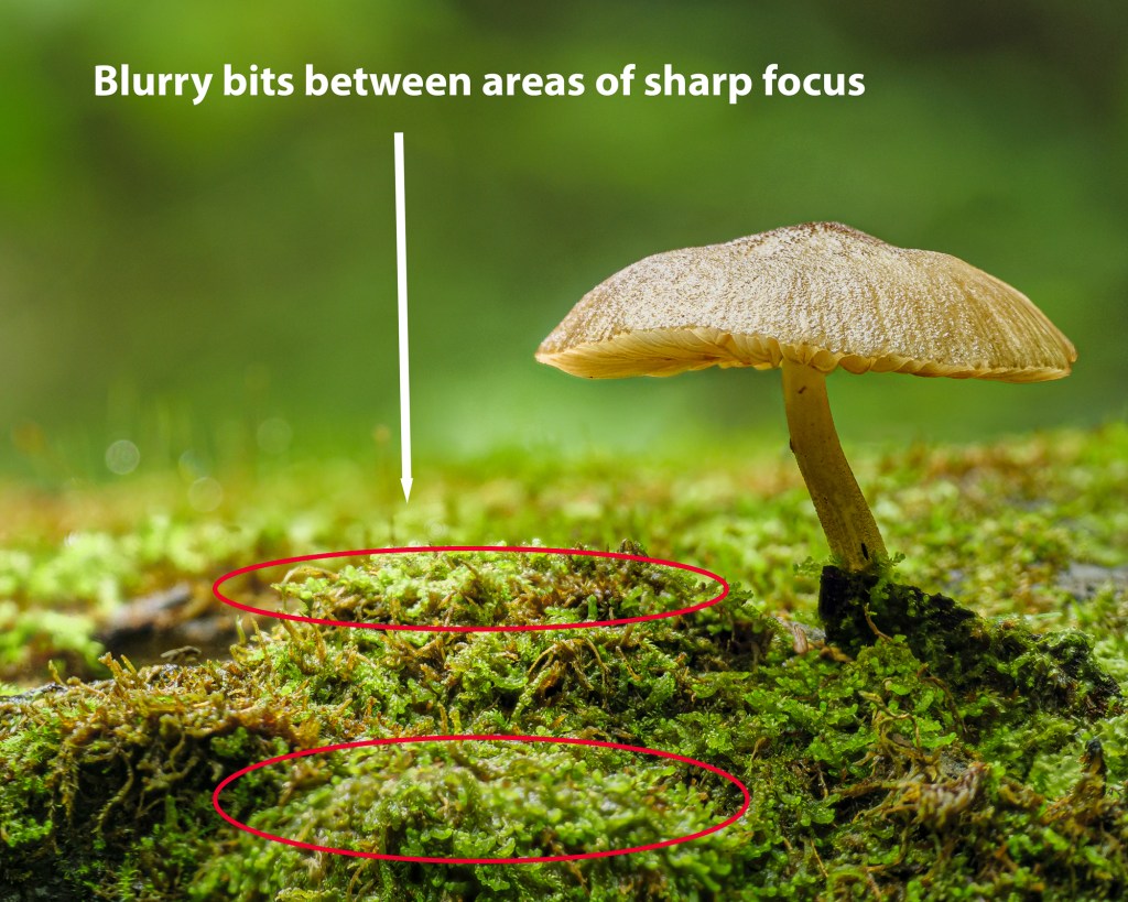 Sometimes I don’t listen to my own advice. In my Focus Stacking Part 1 post I said that it was better to have too many images than too few and it’s true. But I got lazy when I found this gorgeous little mushroom on a log. Instead of doing a proper focus bracketing session, I manually chose different focus points in the scene. At the time the light was changing drastically because of wind in the canopy and I thought that if I timed things right I would have a better chance of blending the photos together.