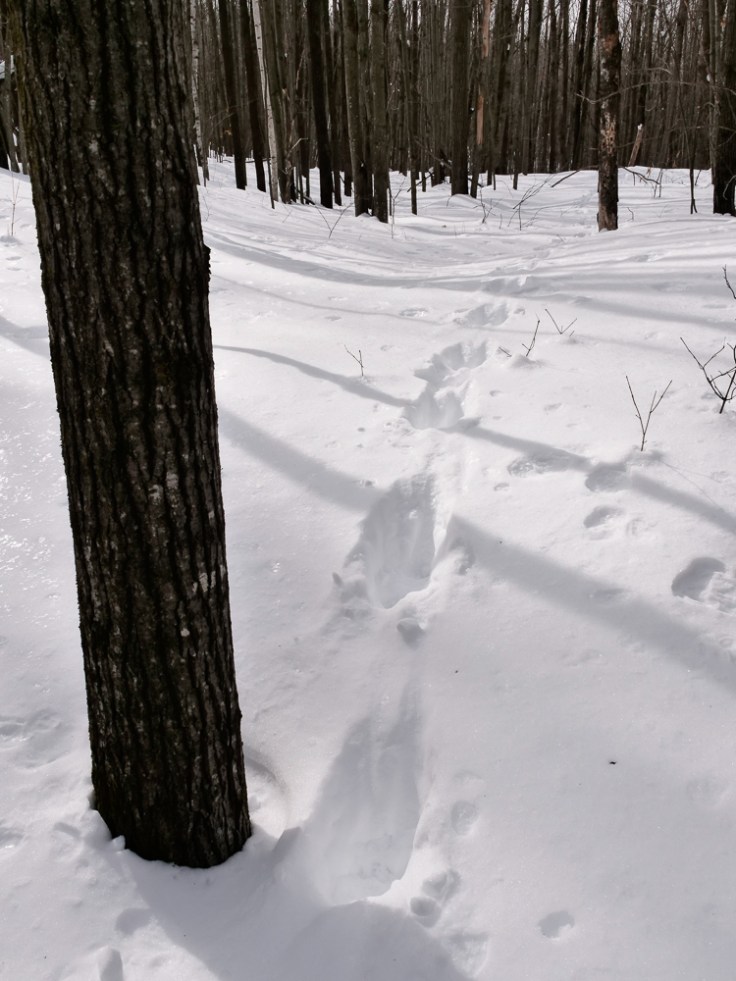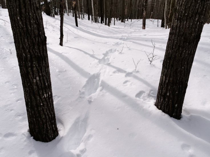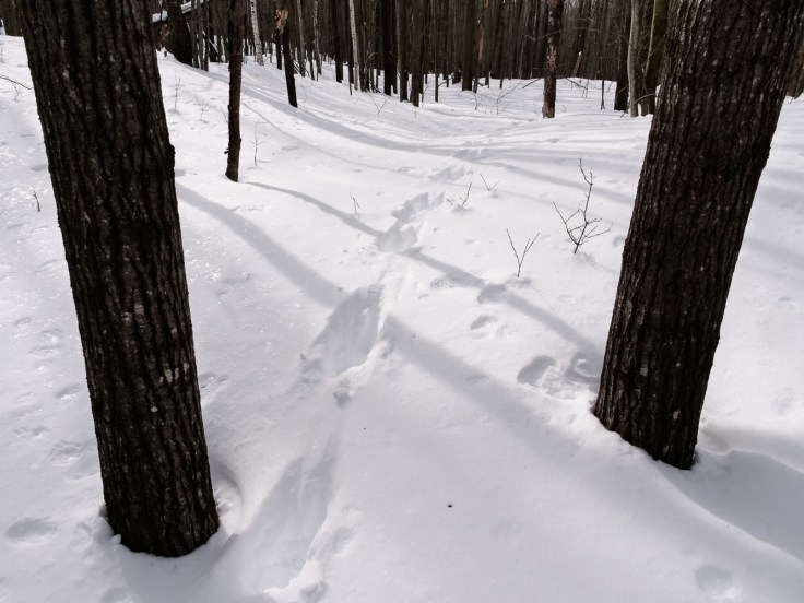 In the end, I have the most interesting and graphically harmonious parts of the photo. You don’t need to see the rest of the woods to deduce it probably is in the woods. I don’t think having all that distraction tells the story better. The story is a deer frantically bounding away through deep snow. Under normal circumstances, deer walk through deep snow. If they’re in a hurry, they can’t run, but have to jump. What set this one off? What was it trying to escape from? What scared it? That’s what should be going through our minds seeing this, not wondering about all the other trees or the one leaning on the left. Or why the photographer didn’t get her lens hood straight the first time. LOL.