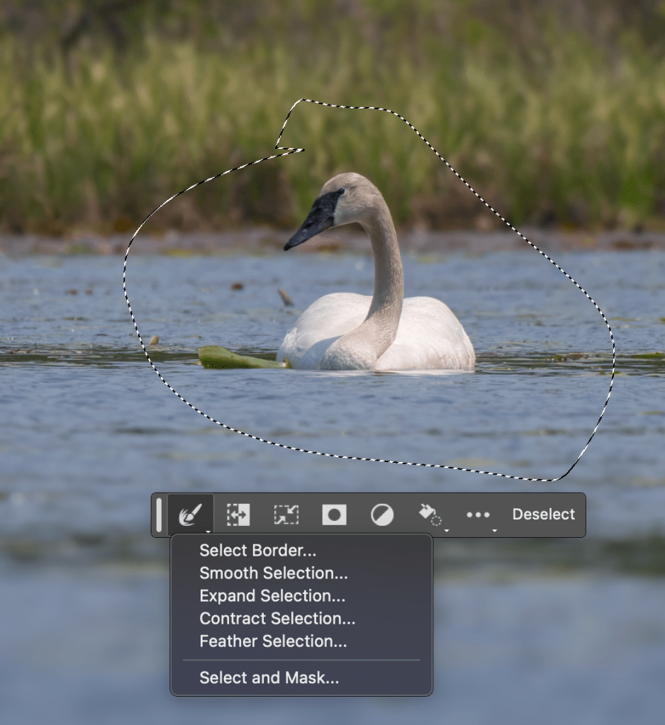 The tiny white triangle in the lower right corner means the tool itself can be expanded or altered like it does in your regular toolbar. Here’s a look at the dropdown for the Modify Selection tool – convenient.