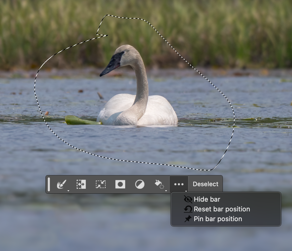 The Contextual part means the options change depending on what tool you are using and it’s exciting to think of what will be added down the road. For example I’ve made a selection with the Lasso tool and it changed to this. The buttons from left to right –
