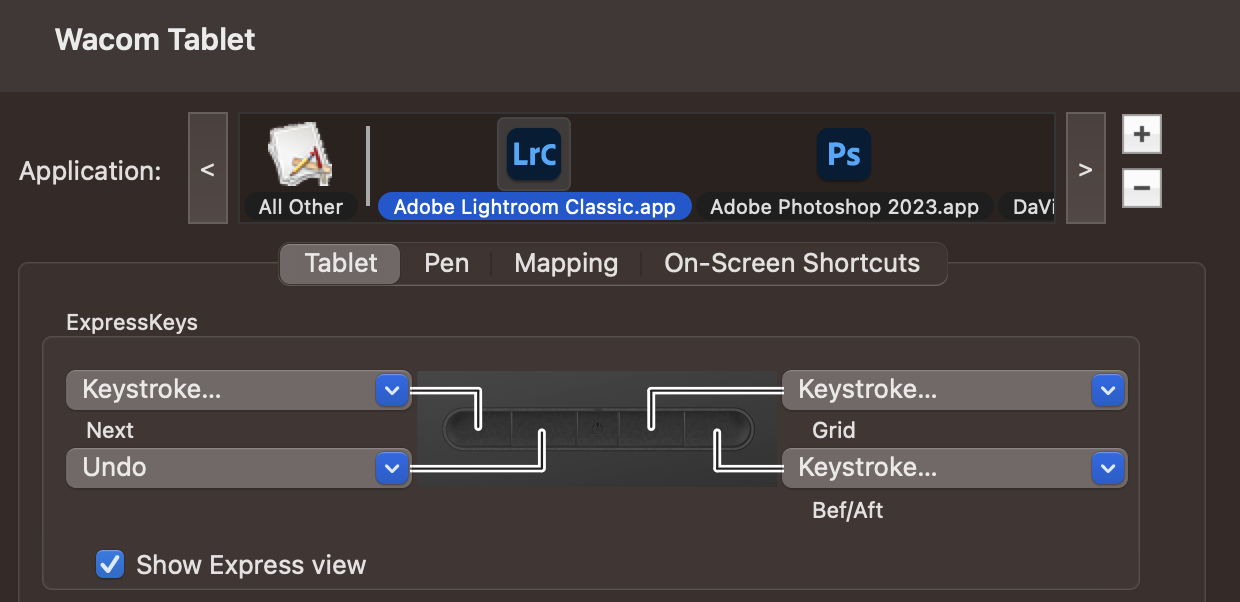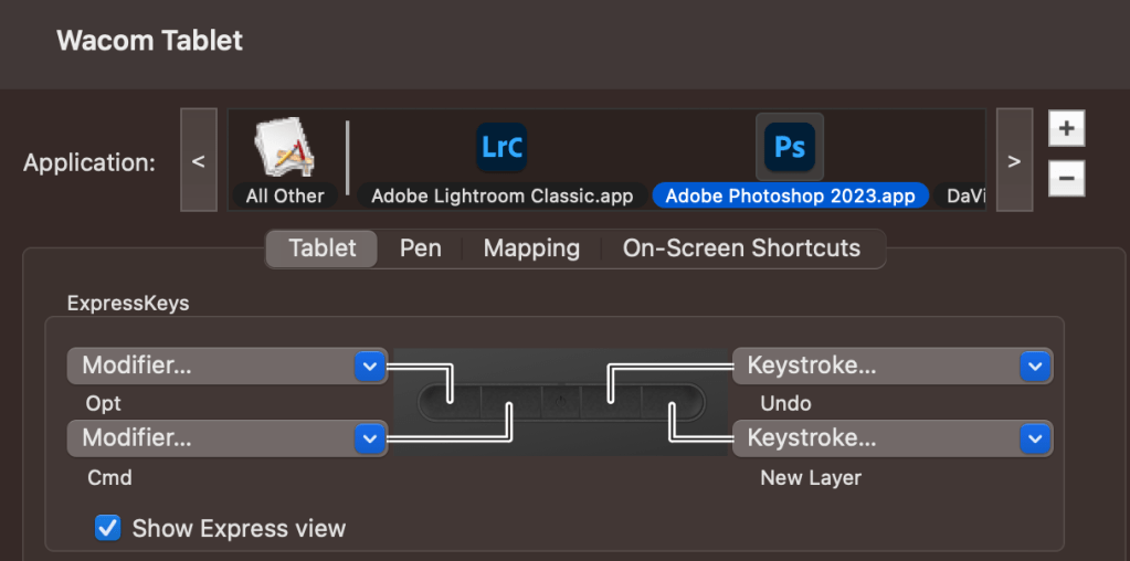 There are two ways you can customize the tablet for each application you use. Although I could use it for other apps, so far it’s only Lightroom and Photoshop. Here’s how that looks –