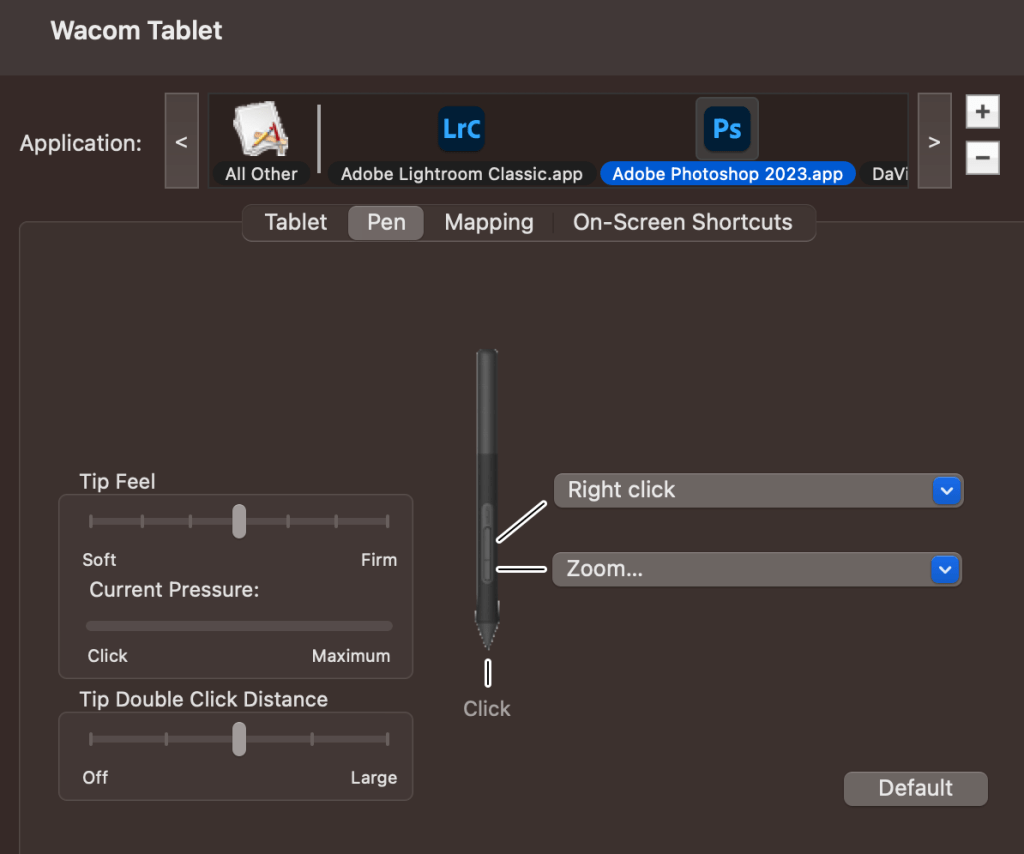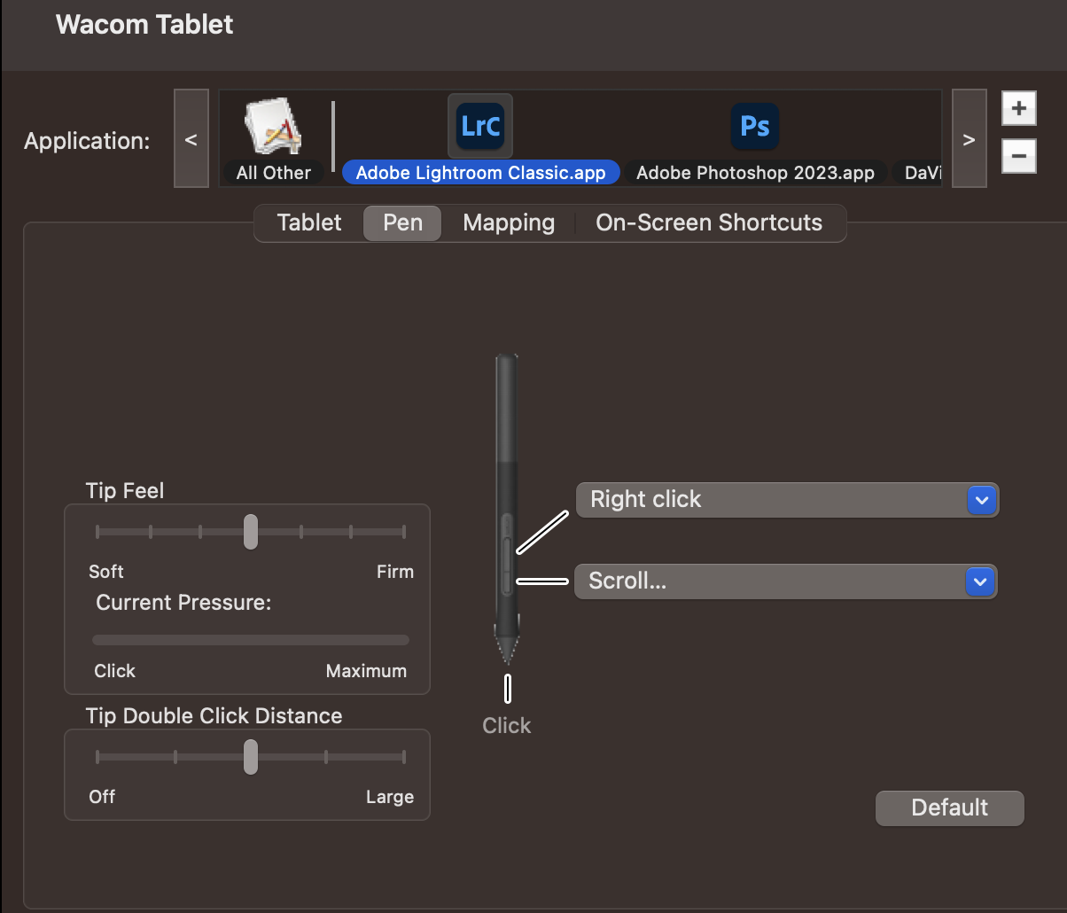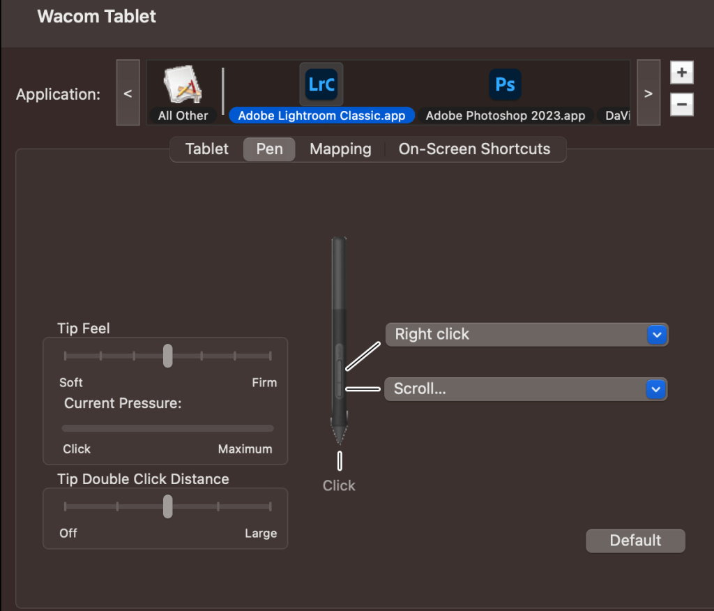 Above are the button assignments for Lightroom – Next image, Undo, Grid view, Before/After toggle. This next one is for the pen buttons –