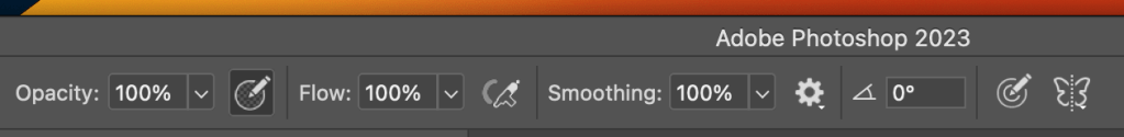 That little pen circle icon between opacity and flow is what you want – turn that on and if your opacity is at 100%, you have to press quite hard to get that level. Moving the opacity % lower just means that the maximum pressure on the pen will be whatever the maximum you’ve set. You can also adjust the pen sensitivity in the Wacom control center. The airbrush effect tool between Flow and Smoothing works as advertised – that is to build up an effect slowly with multiple brush strokes. I’ve never used it, but have used low opacity brushes one after the other to achieve a similar effect. The angle adjustment doesn’t have any noticeable difference on my edits and I don’t have the other pen control to the far right turned on either. That one adjusts the brush size with pressure and I prefer using other ways to manage that. The butterfly on the far right is for mirror control of the brushes, something cool for artists, but not especially useful for photographers. Open a blank document with a colored brush and play with it to see what it does. It’s kind of fun in a way.