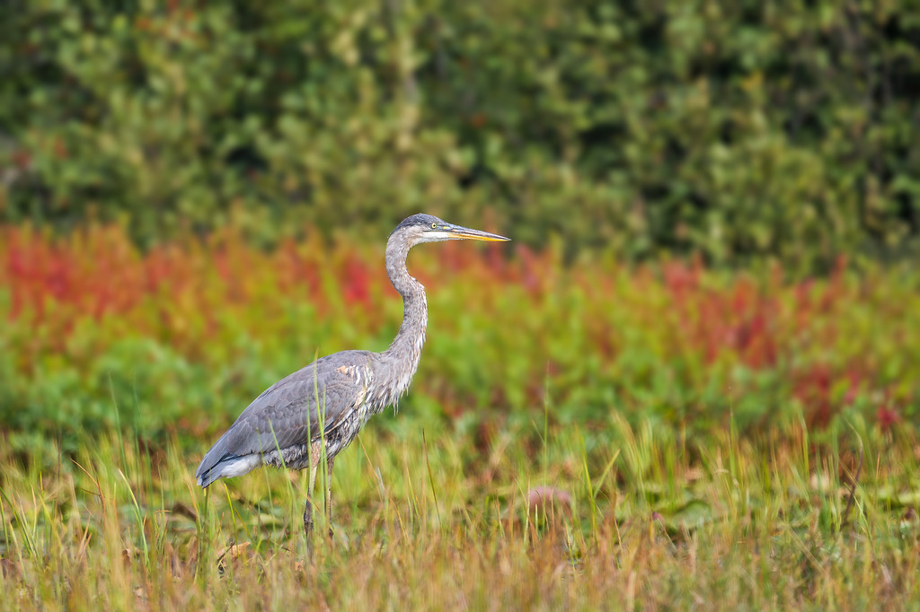 And here’s a still I also took in the process. It might be why I missed the catch. Switching from video to stills takes a little fiddling and sometimes I have the worst timing. Even so, this still is pretty good. The red in the background was a nice bonus. I love how it sets off the cooler tones of the heron.