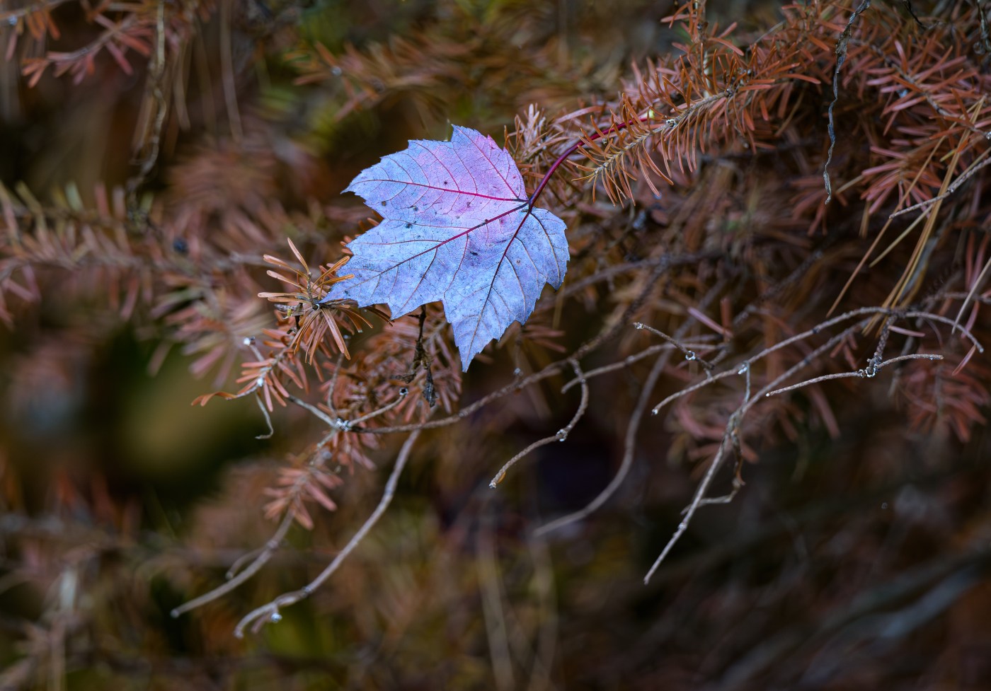 This leaf caught in a dead conifer caught my attention while I was studying the shoreline. Those colors are real – I think it’s a Red Maple leaf and so when it turns in the fall we get these pinks, blues and purples.