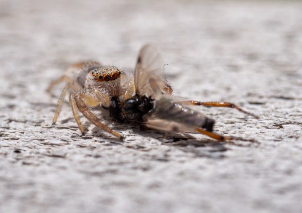 A ravenous spider takes down prey on my deck railing - with macro video of a pounce!